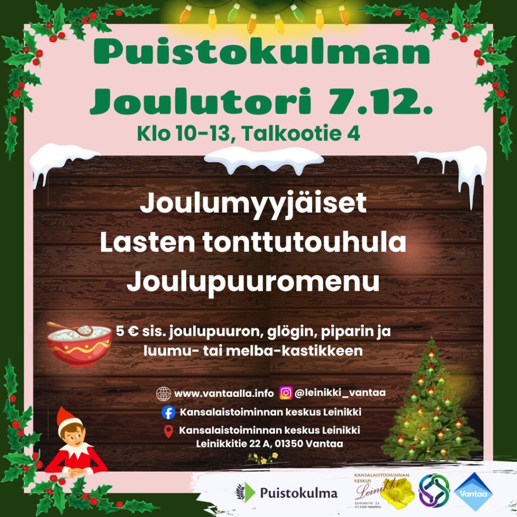 Puistokulman Joulutori 7.12. 2025 klo 10 – 13 tarjoaa yhdistyksille edullisen mahdollisuuden varainhankintaan!