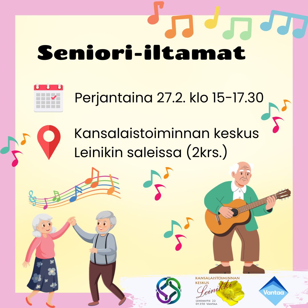Seniori-iltamat ovat saaneet suurta suosiota iloisen tunnelman ja livemusiikin ansiosta! Tällä kertaa iltamissa kuullaan livemusiikkia ja päästään pistämään jalalla koreasti Heli & Pojat livebändin tahtiin. Tarjolla on myös kahvia ja pientä syötävää. Tapahtuma on maksuton!